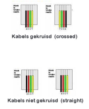 Een aansluitkabel voor tussen het toestel en de hoorn kan gekruisd of juist niet gekruisd zijn aangesloten. Controleer dit voor de zekerheid dus even aan de hand van uw "oude" kabel en de afbeelding hieronder.