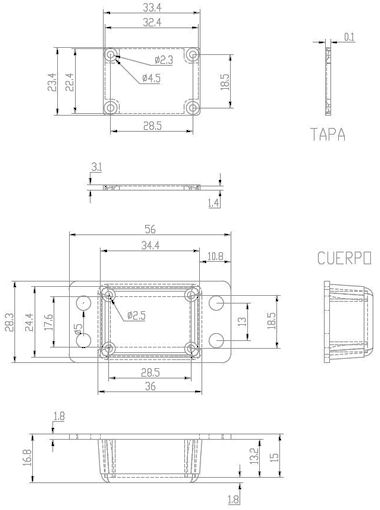 Klein inbouwkastje met montagegaten voor oppervlaktemontage - 56 x 28 x 15mm